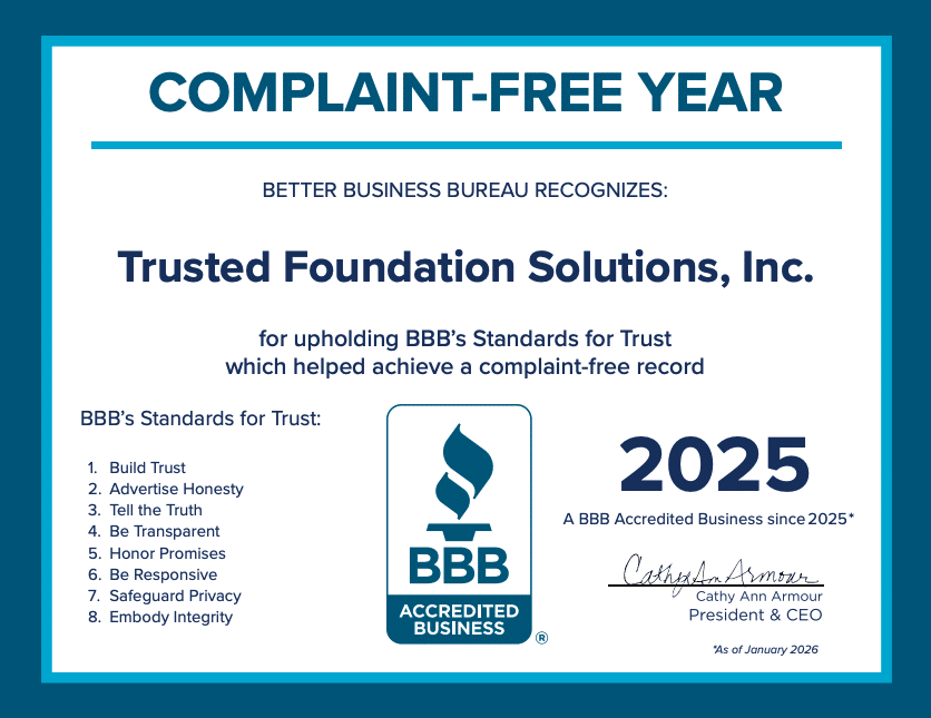 Foundation Repair Services Phone (317) 559-2882 Address 8367 Morgan Street Stilesville, IN 46180 Email office@trustedfoundationsolutions.com FOUNDATION SOLUTIONS Featured Foundation Services SOLUTIONS CRAWL SPACE REPAIR SOLUTIONS BASEMENT WALL REPAIR SOLUTIONS FOUNDATION REPAIRS SOLUTIONS BASEMENT WATERPROOFING SOLUTIONS CONCRETE LEVELING SOLUTIONS EGRESS WINDOWS & DOORS We Don't Just Repair Foundations, We Restore Your Peace of Mind Request FREE Evaluation